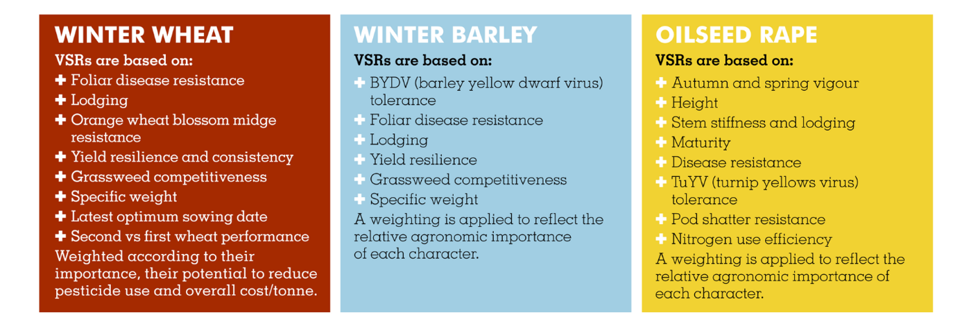 Scores are also added for traits which reduce pesticide usage in the crop, e.g. wheat orange blossom midge, BYDV, TuYV and pod shatter resistance